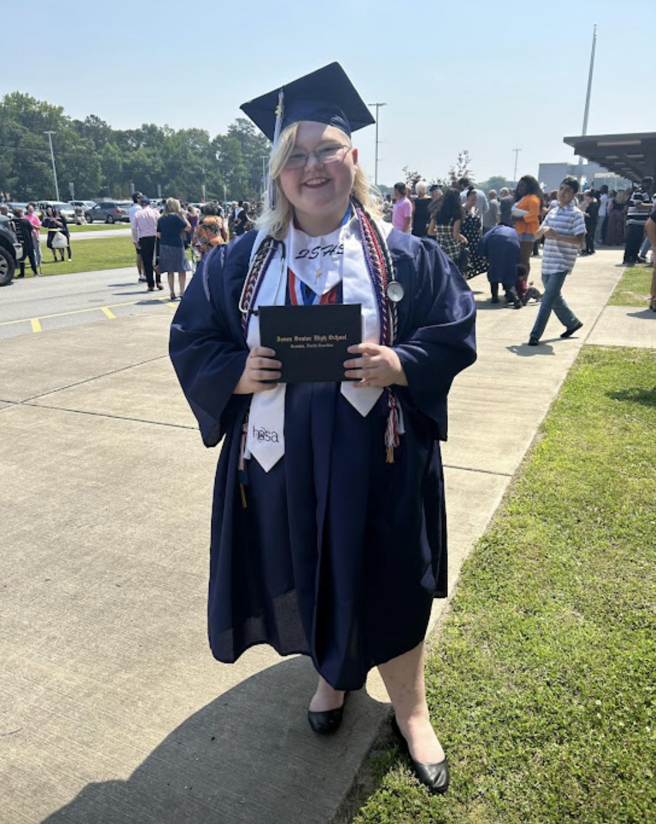 Now, in my senior year, I have been gratefully gifted the opportunity to demonstrate my abilities. I have finished the health science pathway and along with becoming CPR certified, vision-screening certified, and OSHA certified for the healthcare workplace, I graduate as a CNA and walk across the stage with a red honor cord. I became OSHA certified with construction and finished the “risky” class with an A.